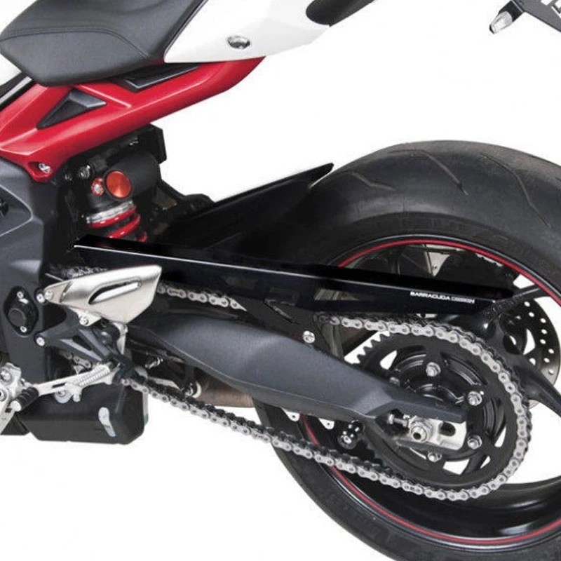 Cubrecadena en aluminio negro de la marca Barracuda específico para su montaje en TRIUMPH STREET TRIPLE R (2013-2017)